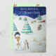 This cute snowman snow scene on this original customisable christmas invitation is looking very excited as he watches santa walking down the hill behind him, the sleigh is parked up in the background and the reindeer are resting close by. The snowman is wearing his best black hat and he has his red and green stripy Christmas stocking tied to a twig in the snow. The customisable text on this great christmas party invite is simple and suitable for everyone, it can be personalised with your own text if you wish to do so. The original cute Christmas illustration is painted in water-colour and is titled “Santa’s Coming.”