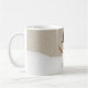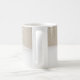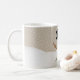 This festive design mug features Destei's cartoon illustration of a cute snowman. The snowman is wearing a black hat and a scarf that has green and white stripes. The background colour is beige with a pattern of white dots. Under the snowman there is a personalizable text area for a name in green colour.