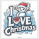 A cheerful cartoon snowman wearing a red hat and scarf stands above bold 'LOVE' and 'Christmas' lettering, conveying warmth, joy, and festive holiday spirit for holiday cards, banners, and decorations.