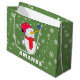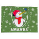 Cute Snowman with Snowflakes Kids Christmas Large Gift Bag. Snowman Christmas holiday gift bag for children. Personalise it with child`s name. The design has a cute snowman with a snowflake on his nose. The background is green with beautiful white snowflakes in different sizes and shapes. Make your Christmas gifts for kids special with this funny and cute holiday gift bag. Kids will love it.