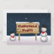 2 cute snowmen are looking to a wooden sign in a snowy winter scene.