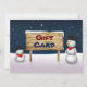 Winterly graphic illustration featuring two cute snowmen holding a wooden sign in a snowy environment.