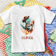 This personalised t-shirt features a hilariously adventurous T-Rex dinosaur. Our little dino wrangles a space rodeo, sporting a classic cowboy hat tilted over a sleek astronaut helmet. He rides a mighty space rocket like a bucking bronco, stars swirling around him in a cosmic adventure. Personalise this shirt with your child's name for a truly out-of-this-world gift!