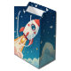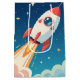 Cute red and white rocket blasting off in space with whimsical stars and clouds.
