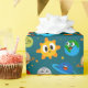 Wrapping paper with a cyan background featuring simple illustrations of suns, Earths, moons, stars, and planets with eyes. A fun and light design for kids' gifts and birthdays.
