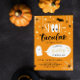 Cute Halloween birthday party invitation with Spooktacular written in a combination of fun fonts, the double o's in spook designed to look like large eyes. The text is surrounded by golden stars, spiders, and a bat. And a cute ghost tells your guests the birthday child's name and age. The back features matching stripes in black, white, and orange.