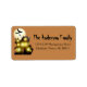 A cute Halloween black lite up haunted house, moon and bats address label for stationary or party invitations.