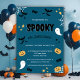 Cute Kids Halloween Party Invitation featuring whimsical ghosts, pumpkins, spiderwebs and bats against a dark blue backdrop. Use the design tools to change the text, font and colours. Also available as digital download.