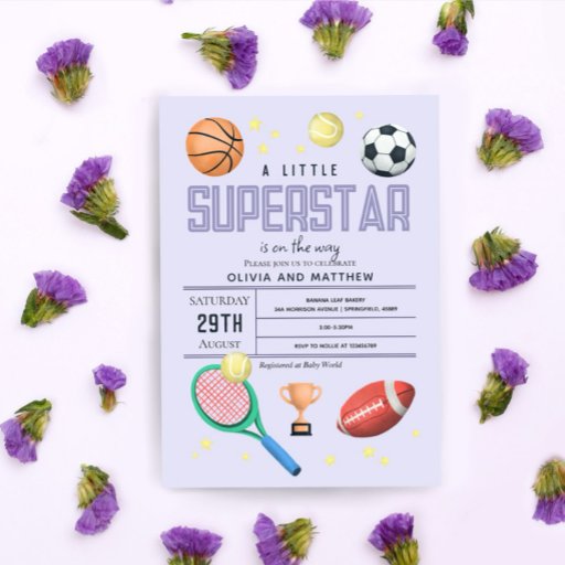 This cute and modern “a little superstar is on the way” girls baby shower paper plate design features a purple sports cartoon illustration, with a basketball, football, soccer ball, tennis racket, trophy, and stars. The plate can be personalised with the parents' names and the date of your party. The perfect sports-themed addition to your girls baby shower.