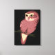 pink and brown spotted owl with big green eyes perched on a green branch, and with black background. sweet owl sitting on a branch and looking cutely with large green eyes in the darkness of night. lovely image for children, adults, and bird lovers, in browns and pinks.