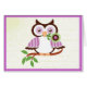 Cute spring owl design, featuring a cute spring owl in purple and dark brown holding a flower in her beak (bill) on a branch with green leaves. An adorable, feminine, decorative design for owl lovers. Some elements by Trina Clark.