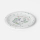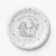 Cute personalized spring party theme plates for your backyard baby shower or birthday party. This design features a polka dot boarder in sage green with a watercolor bunny rabbits encircled by a laurel wreath of botanicals. Personalize with the mama-to-be's name and shower date. To see the matching Easter theme party decor visit www.zazzle.com/dotellabelle