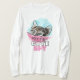 long sleeve woman t-shirt for a funny and cute look with painted spying kitten in ink and watercolor using feminine pink and blue colours in front and meow. typography.