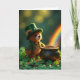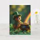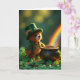A cute, fuzzy teddy bear wearing a sparkly green leprechaun hat and coat admires a rainbow which is coming from a pot of gold. There are shamrocks on the ground around him.