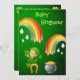 Cute St.Patrick's Day neutral green Baby Shower invites for boys or girls with an adorable baby leprechaun elf sitting on a lucky horseshoe holding a shamrock under a pretty colourful rainbow and raindrops. There is another rainbow and raindrops next to him and underneath it is a pot of Irish gold. The beautiful green background has elegant swirls and flourishes and lucky four leaf shamrocks / clovers. These fun stylish invites are decorated both sides. Text, font and colour of font are all customisable. If you need assistance customising your product please contact me through my store and I will be happy to help.