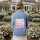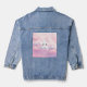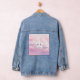 This is a Cloudy Sky Cute Star Denim Jacket. The design is on the back of a blue denim women's jacket. The cute star design was made with generative art. The art features a cute white star on a pink and lavender sky background. The cute pink design is on a denim jacket. You can buy the denim jacket with 4 interest-free payments with Klarna.