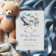 A baby was delivered by a cute stork wearing a blue hat and bow. Red and blue hearts were sourrended by a baby and stork.