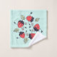 Cute strawberries wash cloth with a vector illustration depicting 5 happy smiling strawberry characters dancing in a circle surrounded by leaves and flowers of their own kind. Fun design with a spring spirit for a person who loves these yummy fruits.