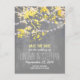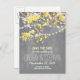 Grey and yellow rustic save the date postcards with cute and fancy blooming tree branches and hanging string of lights. Perfect save the date for outdoor wedding.