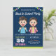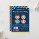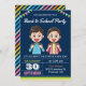 Amaze your guests with this colourful party invitation featuring cute kids with backpacks and vibrant typography against a blue background. Simply add your event details on this easy-to-use template to make it a one-of-a-kind invitation. Flip the card over to reveal a colourful stripes pattern on the back of the card.