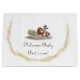 Cute Stuffed Animal Themed design features the image of loveable stuffed animals gathered together to welcome Baby. Your personal message is displayed below image in a golden brown decorative font. Designed to accompany the Cute Stuffed Animal Baby Shower invitations and accessories.