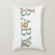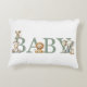 This custom baby nursery pillow features a sage green coloured, gender neutral theme with illustrations of cute little stuffed animals. The word "BABY" is printed in capital letters across the top portion. Animals stuffies accent the letter. A cow stuffy and mouse are placed on the left, with a lion cub in the centre. A baby elephant and duck are placed on the right.