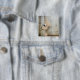 Button with a darling photograph of a cute stuffed bear, standing by a rustic wooden wall / backdrop.