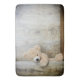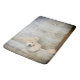 A bath mat with a darling photograph of a cute stuffed bear, standing by a rustic wooden wall / backdrop.