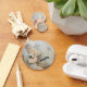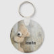 A key chain with a darling photograph of a cute stuffed bear, standing by a rustic wooden wall / backdrop.