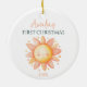 Adorable baby's 1st Christmas ornament with a cute sun illustration smiling, personalised with a name and year. Gender-neutral and double-sided design. Ideal newborn keepsake for the Holidays.
