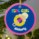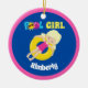 Awesome swim team girl Christmas ornament gift. Features a bright, fun pop of colours and an adorable swimming blonde girl in an inner tube. Customise with your child's name. Pretty present for a swim teacher.