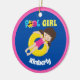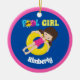 Awesome swim team girl Christmas ornament gift. Features a bright, fun pop of colours and an adorable swimming brunette girl in an inner tube. Customise with your child's name. Pretty present for a swim teacher.