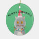 Adorable tabby cat dressed in Christmas lights wearing a Santa hat. Ornament reads Meowy Christmas.