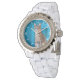 A blue tabby cat sitting on a blue chair in front of a blue wooden door, I took the picture of this cute kitten during a holiday in Cyprus. This rhinestone watch for women with dial-plate is a gift idea for cat lovers. A young kitty photo taken by Katho Menden. http://www.zazzle.com/kathom_photo