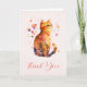 Folded thank you card with an adorable watercolor illustration. An orange tabby cat looking friendly and happy with hearts swirling around.