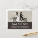 Cute Tandem Bike Bride And Groom Wedding save the date card in brown tones featuring a bride in a wedding dress with a small red heart on the veil and a groom in his suit.. stunning custom wedding save the date postcards.. add your own text .. designer wedding products by Ricaso