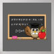 An illustration of a cute teacher owl with adorable white moustache wearing a graduation cap with yellow tassel and holding a red apple. He is writing on the blackboard and teaching letter alphabet and a simple math. This kawaii cartoon design is for bird lovers and animal lovers, and a gift idea for teacher's appreciation day in school.