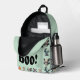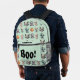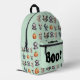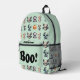 This fun, kids Halloween backpack features a playful design with a light teal background and charming watercolor crochet-style Halloween monsters, each with a unique, endearing appearance, adding a touch of craftiness and fun. " Boo!" is on the front pocket with an editable name just above!