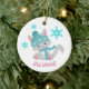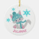 An adorable little grey and pink kitten wears a snowflake cap and scarf while bright teal snowflakes drift down around it. At the bottom is your child's name in matching pink, and everything is placed on a white background. The back of the ornament has a teal snowflake pattern border, with a white circle at the centre that contains your custom text in four fields. Easy to customise, and any little girl would love this keepsake ornament!