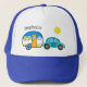 On our cute personalised travel cap for vacationers, road-tripping retirees, and full-time RVers, a small aqua car pulls a colourful blue and orange teardrop camper. The text above the travel trailer currently says, "Stephanie" and can easily be personalised with your own name or other words. Additional coordinating travel accessories are available.