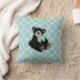 Sweet baby's room decor accent throw pillow done in an aqua and white quatrefoil pattern, with graphics of a cute dark brown teddy bear. Customise to add any text you want to this adorable pillow. Matching products available.