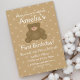 A cute grizzly teddy bear baby first birthday party invitation. Background is brown and polka dots pattern.
