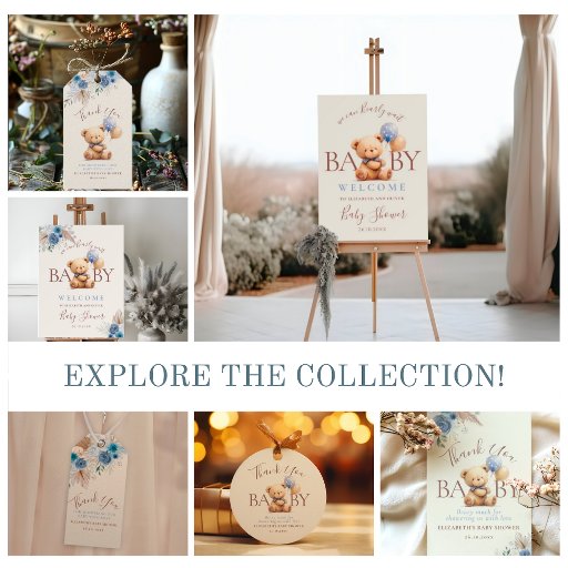"The 'Baby Shower Teddy Bear with Two Balloons and Boho Blue Roses' collection is perfect for creating a dreamy event. With a loveable teddy bear and two balloons, this collection combines graceful blue roses with cosy, boho details.