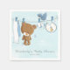 This cute teddy bear themed baby shower party napkin for guests features a hanging brown bear and baby laundry along with a blue bird over a blue watercolor background.