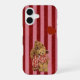 Adorable iPhone case featuring two cuddly teddy bears standing together with matching outfits on a red striped background and a sweet heart detail.