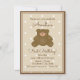 A cute grizzly teddy bear cub baby first birthday party invitation. Background is light beige and white polka dot pattern.
