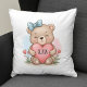 This adorable personalised nursery throw pillow features a watercolor teddy bear wearing a blue bow, happily hugging a glossy pink heart, and sitting among gentle flowers that show love and warmth.