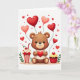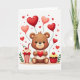 This greeting card features a cute, chubby teddy bear sitting in the center on a plain white background. The bear has soft brown fur, wide innocent eyes, and lightly pink cheeks, and it holds a bright red heart close to its chest ❤️. Above the bear, a bunch of heart-shaped balloons float upward, ranging from deep red to light pink, each tied with a thin green string. Small red hearts are scattered around the balloons to keep the love theme going. On the left side, there’s a red-and-white striped milkshake cup with a little bow, topped with whipped cream, a cherry, and a straw, like a sweet treat for two 💌. On the right side, a cupcake sits in a red wrapper with golden frosting and a tiny red heart on top, with a few small green leaves nearby for a simple frame 🍫. There’s no text printed on the front, so the picture does all the talking. Hope it helps you share kind Valentine’s Day feelings with someone you care about.