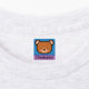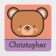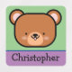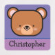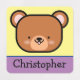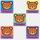 Cute brown teddy bear face with pink blushing cheeks pink ears and a happy face, on a blue, yellow, green, red and purple backgrounds. A template below inside a purple box to add your name to personalise.