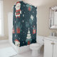 A charming Christmas pattern shower curtain featuring adorable teddy bears dressed as Santa, festive gift boxes, decorated Christmas trees, candy canes, ornaments, and snowflakes on a deep dark green background. This cozy holiday design blends warm, hand-drawn illustrations with a playful winter feel.